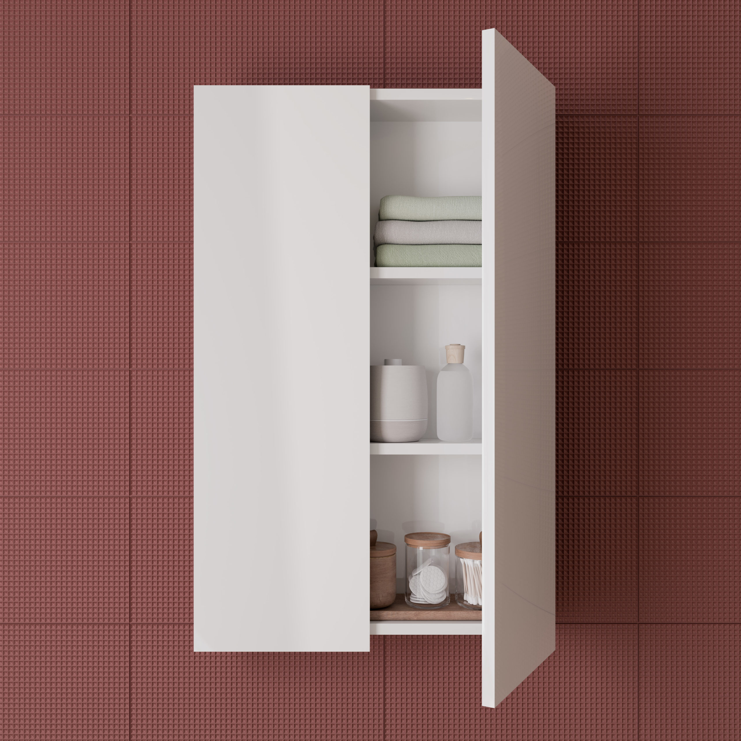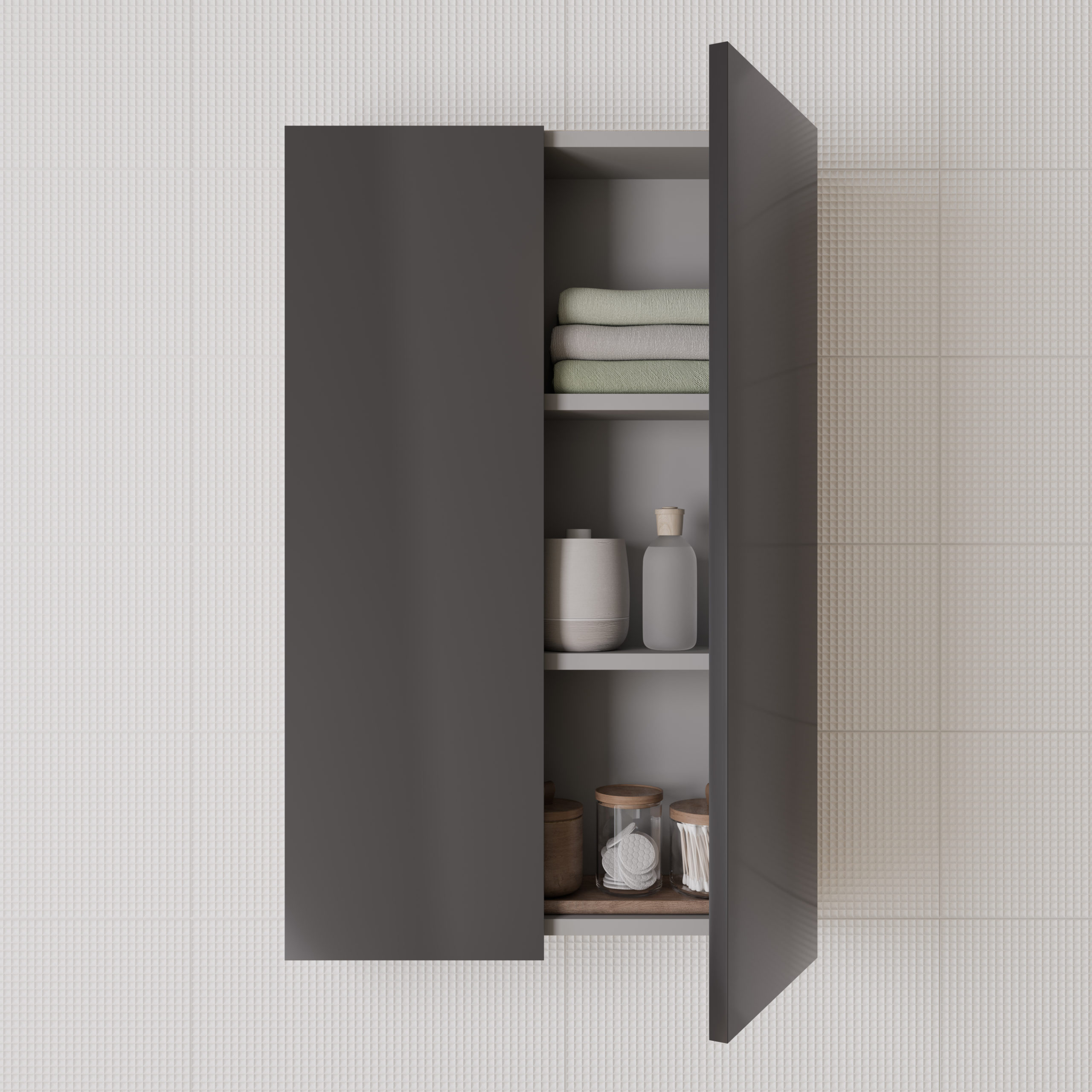 Distribuzione interna: Due ripiani mobili in legno in finitura grigio. Pavimento in finitura grigio. Per la finitura bianco i ripiani ed il pavimento in finitura bianco.